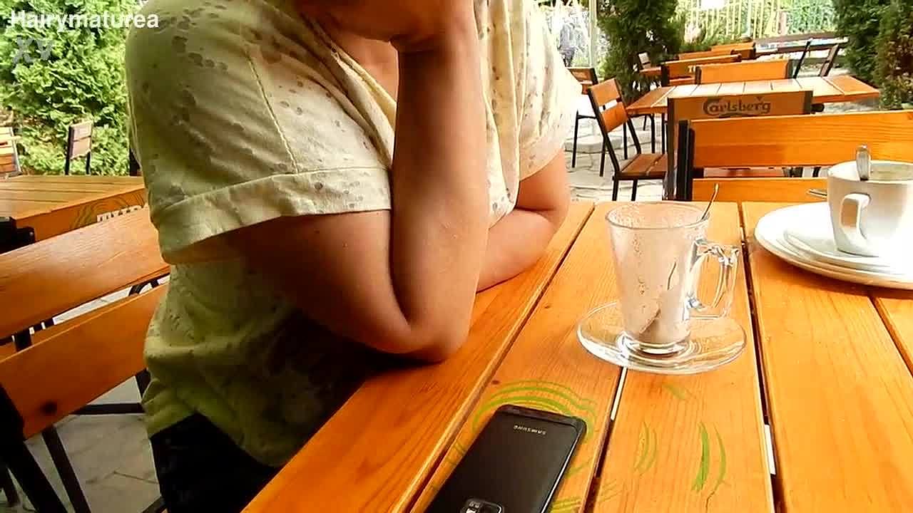 Mature woman with hairy beaver flashes natural tits in public craving anal but getting handjob